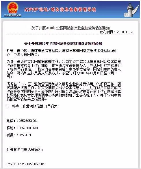 工業(yè)和信息化部將于2018年11月15日至12月10日,通過發(fā)送短信及人工電話呼叫的方式,組織開展2018年全國網(wǎng)站備案信息準(zhǔn)確性抽樣核查工作。