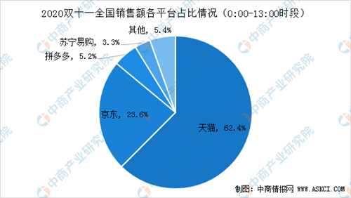 從各大電商平臺來看,在這個時間段,主場作戰(zhàn)的天貓銷售額占全網(wǎng)銷售額的62.4%,京東、拼多多、蘇寧易購分別以23.6%、5.2%和3.3%的占比位居其后。