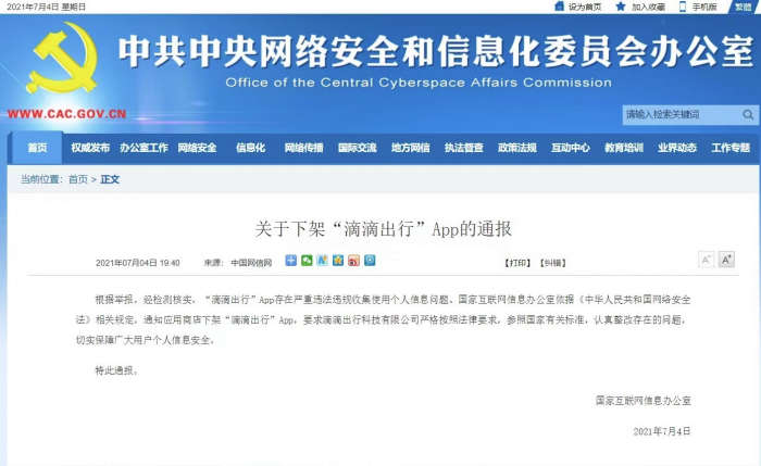 根據(jù)舉報(bào),經(jīng)檢測(cè)核實(shí),“滴滴出行”App存在嚴(yán)重違法違規(guī)收集使用個(gè)人信息問(wèn)題。國(guó)家互聯(lián)網(wǎng)信息辦公室依據(jù)《中華人民共和國(guó)網(wǎng)絡(luò)安全法》相關(guān)規(guī)定,通知應(yīng)用商店下架“滴滴出行”App。