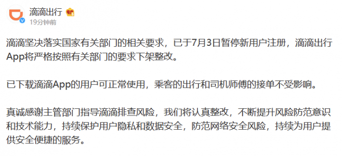 滴滴堅(jiān)決落實(shí)國(guó)家有關(guān)部門的相關(guān)要求,已于7月3日暫停新用戶注冊(cè),滴滴出行App將嚴(yán)格按照有關(guān)部門的要求下架整改。已下載滴滴App的用戶可正常使用,乘客的出行和司機(jī)師傅的接單不受影響。