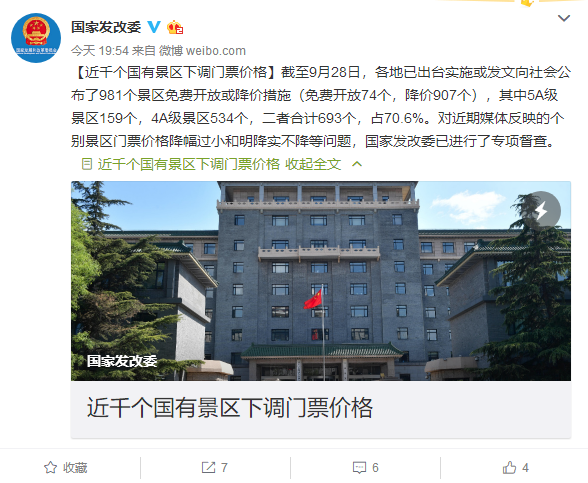 從國家發(fā)改委獲悉,截至9月28日,各地已出臺實施或發(fā)文向社會公布了981個景區(qū)免費開放或降價措施(免費開放74個,降價907個),其中5A級景區(qū)159個,4A級景區(qū)534個,二者合計693個,占70.6%。