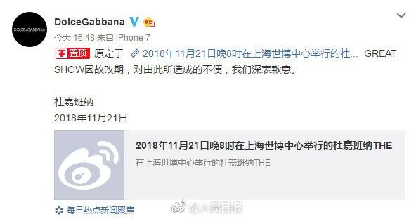 面對(duì)大眾“零容忍”的態(tài)度,杜嘉班納于21日下午宣布在上海舉辦的時(shí)裝秀“因故改期”。