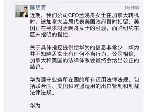 對此,華為董事、高級副總裁陳黎芳在朋友圈回應確有此事。她表示,近期,公司CFO孟晚舟女士在加拿大轉(zhuǎn)機時,被加拿大當局代表美國政府暫時扣留,美國正在尋求對孟晚舟女士的引渡,面臨紐約東區(qū)未指名的指控。