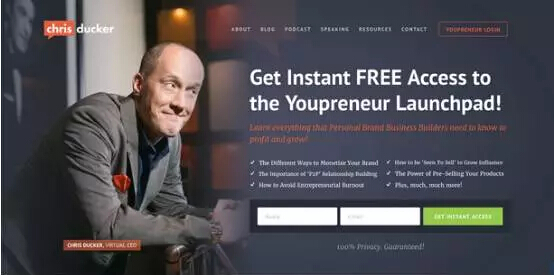 Chris的頁面設(shè)計(jì)做了較大更新。這個(gè)主頁的轉(zhuǎn)化率也非常高,這和主頁背景上Chris的眼睛一直望向郵箱地址填寫欄有關(guān)。稍后我們?cè)俜治鰹槭裁催@樣的背景圖片能夠提高轉(zhuǎn)化率。