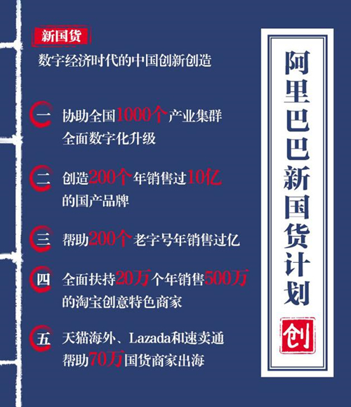 8日,阿里巴巴發(fā)布“新國貨計(jì)劃”,其將協(xié)助全國1000個(gè)產(chǎn)業(yè)集群全面數(shù)字化升級(jí);創(chuàng)造200個(gè)年銷售過10億的國產(chǎn)品牌;幫助200個(gè)老字號(hào)年銷售過億;全面扶持20萬個(gè)年銷售500萬的淘寶創(chuàng)意特色商家;天貓海外、Lazada和速賣通幫助70萬國貨商家出海。