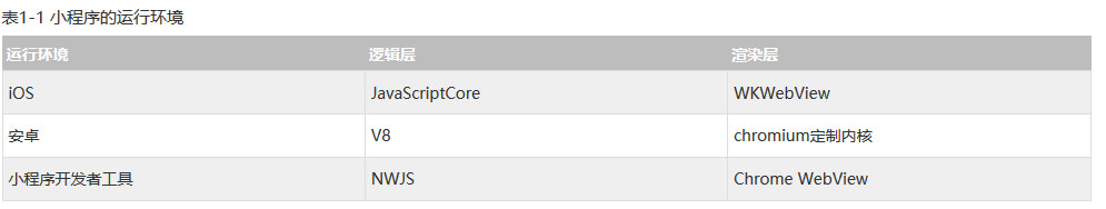 網(wǎng)頁開發(fā)者需要面對的環(huán)境是各式各樣的瀏覽器,PC 端需要面對 IE、Chrome、QQ 瀏覽器等,在移動端需要面對 Safari 、Chrome 以及 iOS、Android 系統(tǒng)中的各式 WebView 。而小程序開發(fā)過程中需要面對的是兩大操作系統(tǒng) iOS 和 Android 的微信客戶端,以及用于輔助開發(fā)的小程序開發(fā)者工具,小程序中三大運行環(huán)境也是有所區(qū)別的,如表1-1所示。